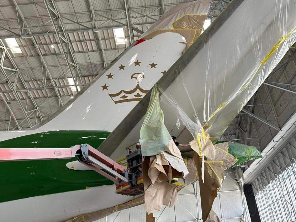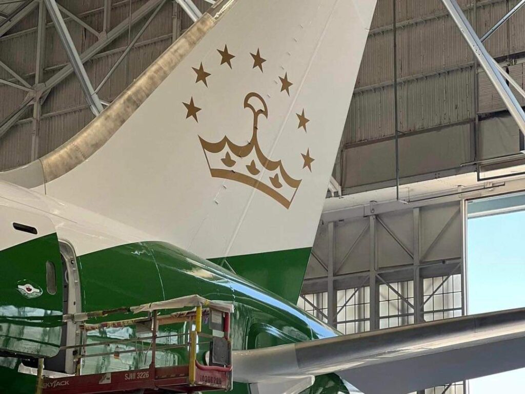 Nomadic OMD, la compañía encargada del transporte, reveló en sus plataformas de redes sociales la reciente modificación estética del avión: franjas de rojo, blanco y verde adornan su fuselaje, complementadas con una corona de siete estrellas como emblema.